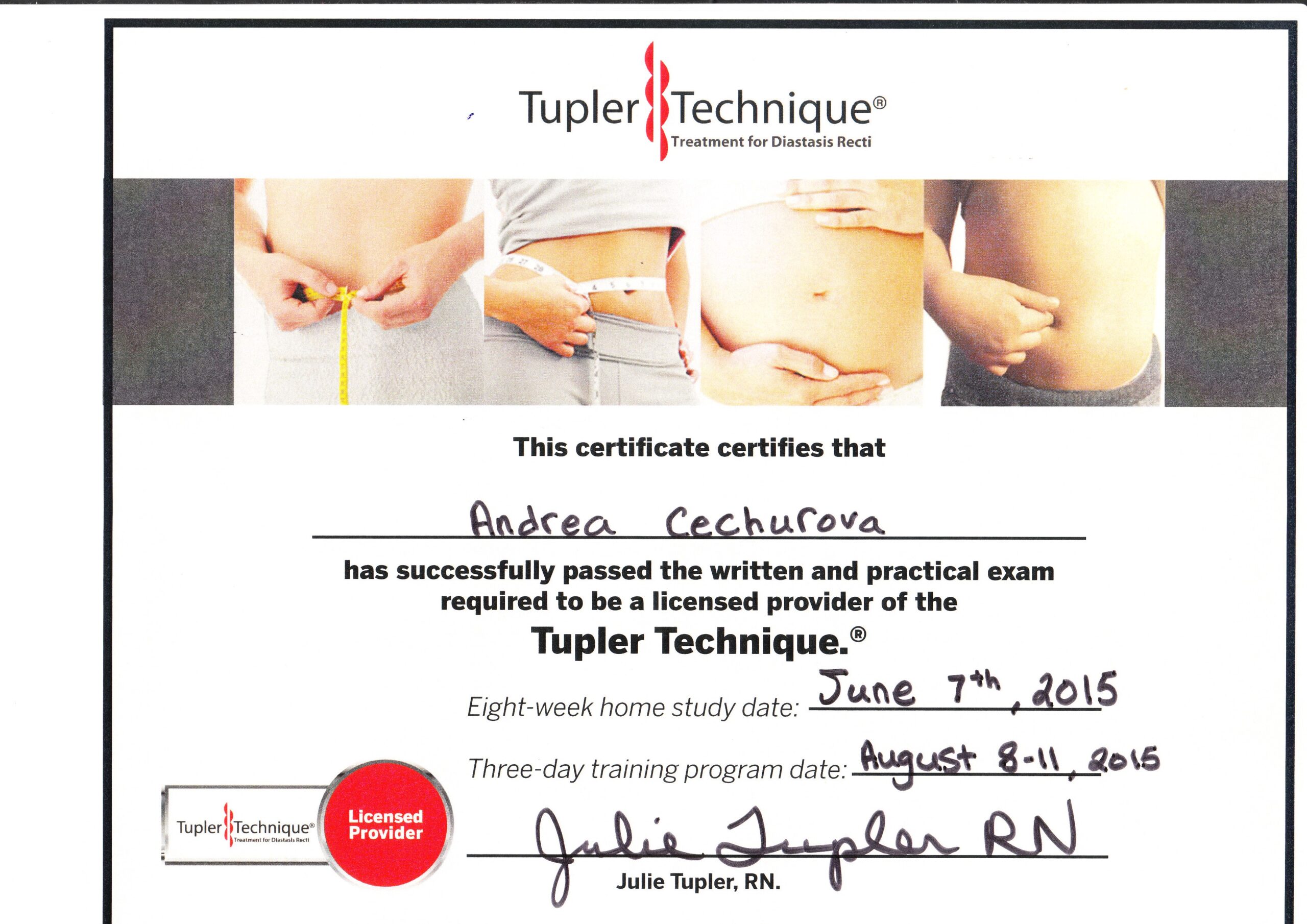 Absolvovala jsem mezinárodní kurzy a získala licenci přímo od Julie Tupler v New Yorku. Jako jediná certifikovaná instruktorka Tupler techniky v České republice pomáhám klientům bezpečně a cíleně nejen s diastázou, ale také se zpevněním hlubokého stabilizačního systému.